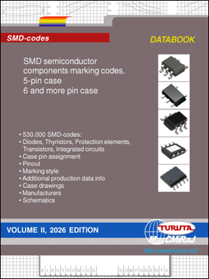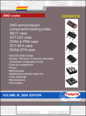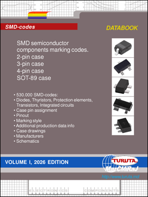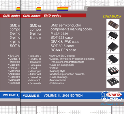 SMD semiconductor components marking codes 2026 edition, Vol.1 databook contains SMD-codes for 2-pin cases, 3-pin cases, 4-pin cases and SOT-89 cases components. Three volumes contain sumarry 530,000 SMD codes for diverse diodes, thyristors, protection elements, bipolar and MOS transistors, integrated circuits and other semiconductor components. |